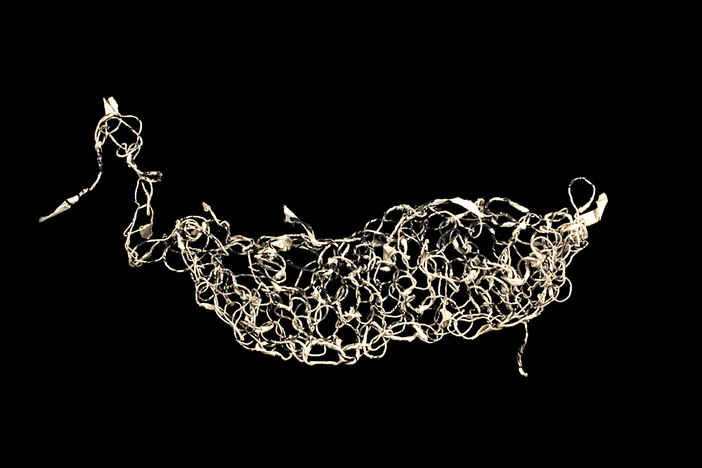 Knitted paper yarn from Yarns for Haiti (Performing on Paper #4, Mobius, January 2010). Knitter: Jane Wang / Photo: Nan Palmer