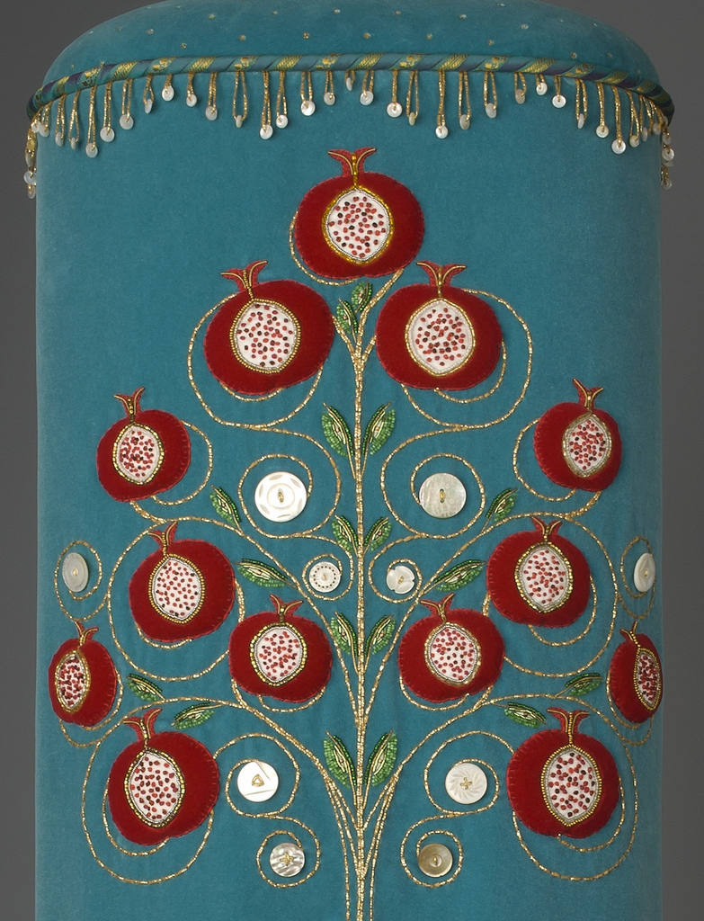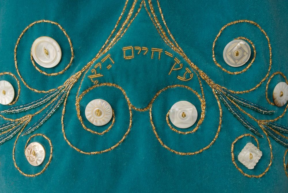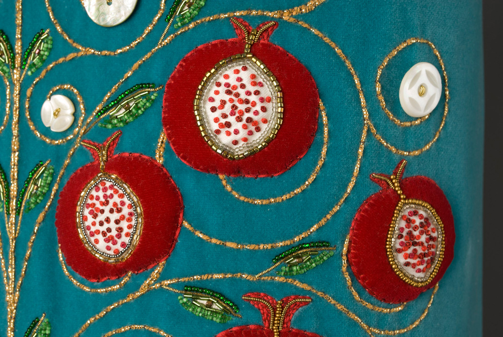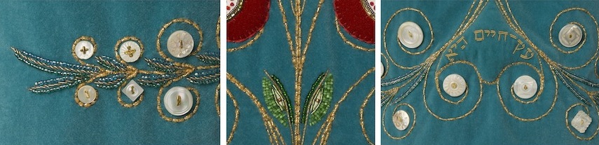 The original design of the Torah mantle’s Tree of Life was to include twelve pomegranates – one for each of the twelve tribes of Israel. Rabbi Liza Stern suggested the inclusion of a thirteenth pomegranate for Dina, Jacob and Leah’s only daughter, which I added to the top. Ten mother-of-pearl buttons were chosen for this portion of the design, inspired by the Kabbalistic Tree of Life. Kabbalists believe the Tree of Life to be a diagrammatic representation of the process by which the Universe came into being. The earliest text to which the sages refer to the ten sephirot is Sefer Yetzirah (Book of Creation). One interpretation is that the sephirot are intangible, and yet serve to bind the structure of the world together. The leaves shown here number eighteen, the numerical equivalent of the Hebrew word ‘chai’, meaning ‘life.’
