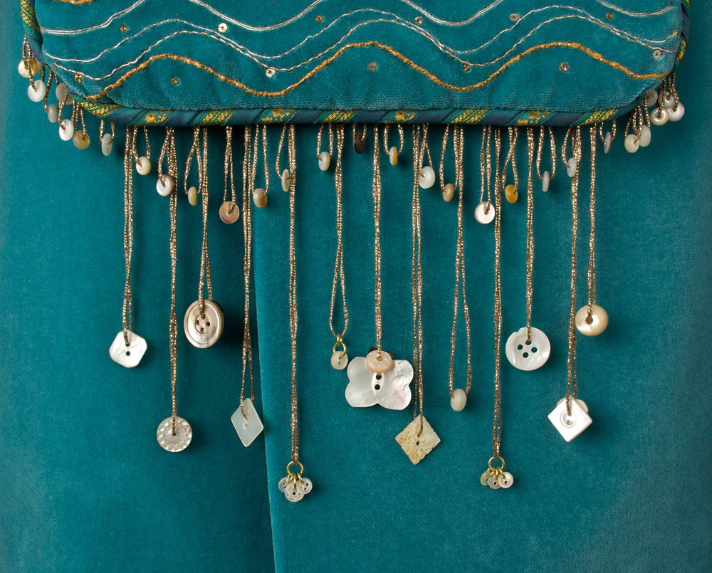 Mother-of-pearl buttons from my personal collection were put out for display, chosen by Eitz Chayim congregants, and collected in a tambourine carried by Rabbi Liza Stern at a Purim celebration in 2009. Mother-of-pearl as a material has meaning in this context, dangling as it does from the bottom and sides of Miriam’s Well, as it originates from oceans and rivers.