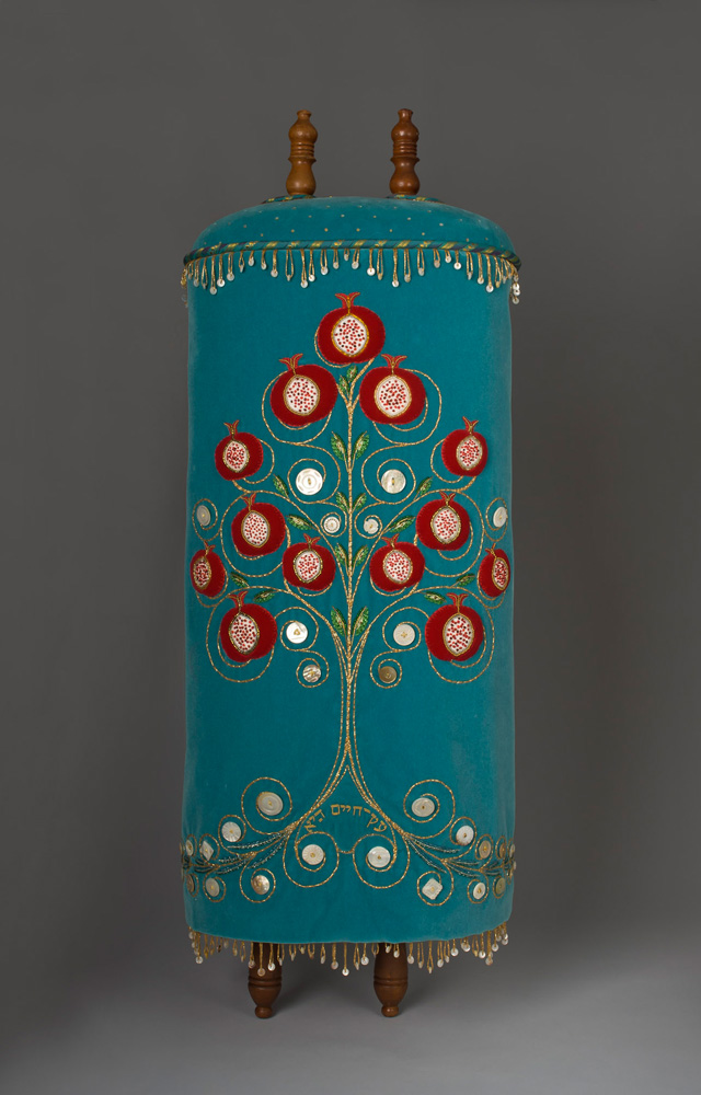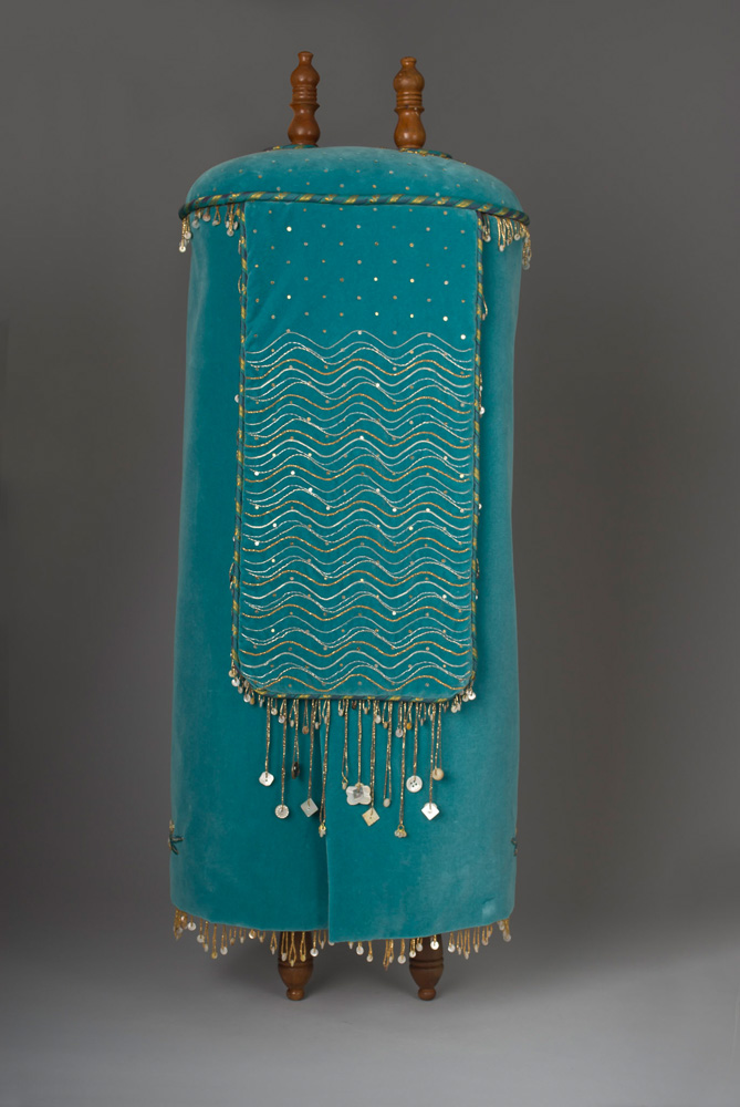 The wooden finials of the Torah scroll are thought to be the ‘atzei chayim’ – the ‘trees of life’ – used to roll the parchment. The structural cap of the mantle resting on the wheels of the scroll is domed in the tradition of Sephardic Torah mantles. Here I was inspired to evoke the celestial firmament using metallic beads and tiny paillettes to articulate sun, moon and stars.